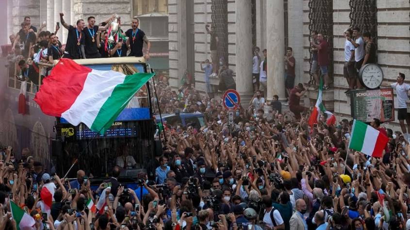 इटली ने रविवार को फाइनल में इंग्लैंड को पेनल्टी शूटआउट में 3-2 से हराकर 53 साल के बाद यूरोपीय चैंपियनशिप का खिताब जीता। इटली के खिलाड़ी जब ट्राफी के साथ स्वदेश लौटे तो उनका जोरदार स्वागत किया गया।